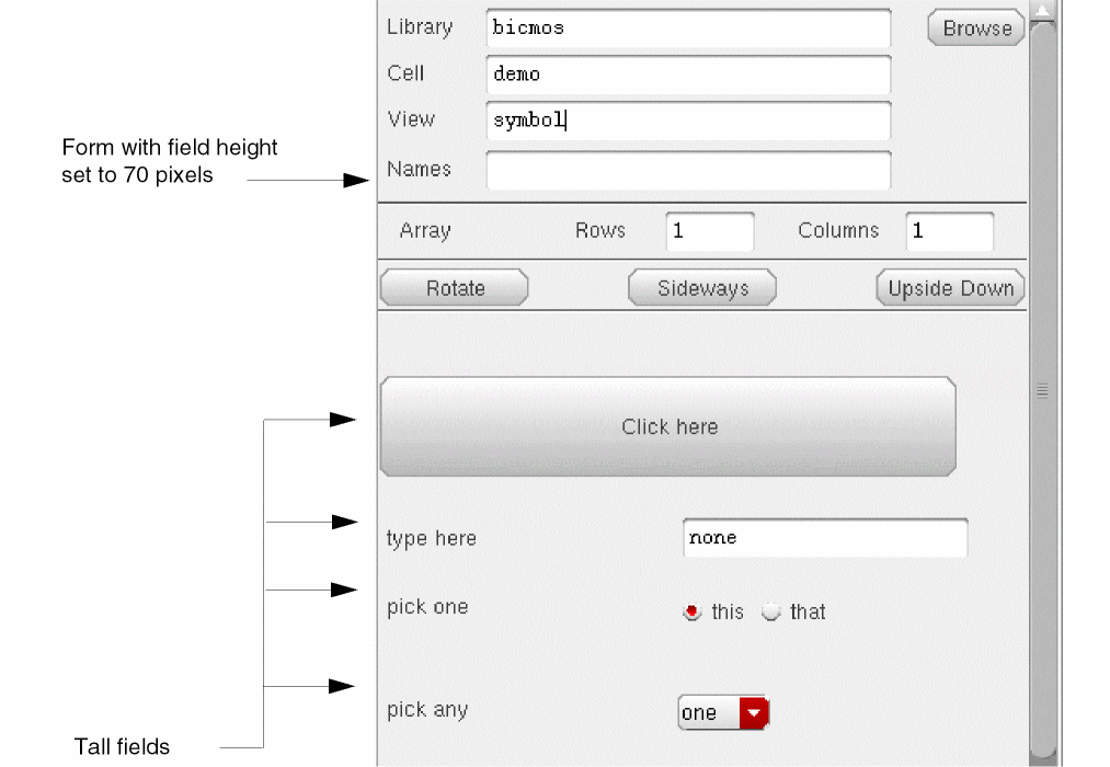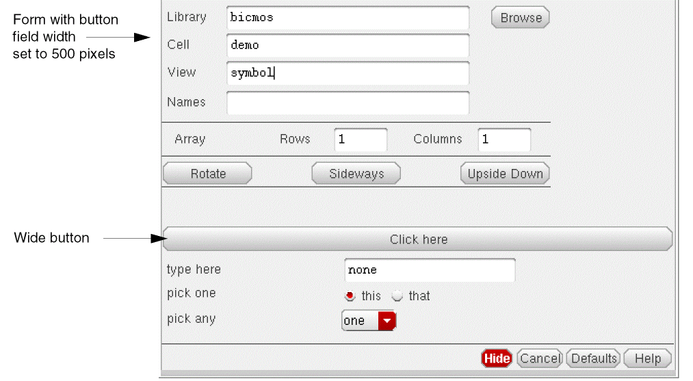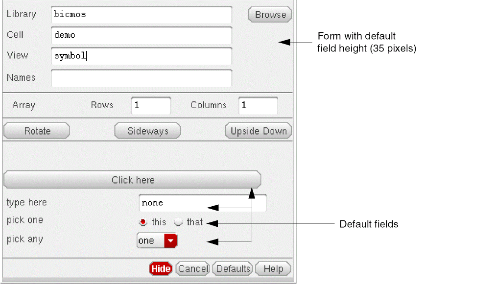 The input fields and prompts for a component are displayed on an instantiation form, such as the Add Instance or Edit Object Properties forms. The following examples show the Add Instance form as it appears when a component is instantiated. The sample CDF description in these examples defines four parameters: a button, a string, a cyclic field, and a radio button field.