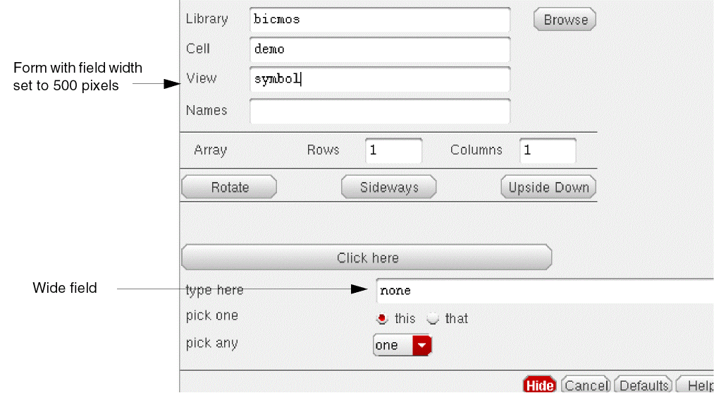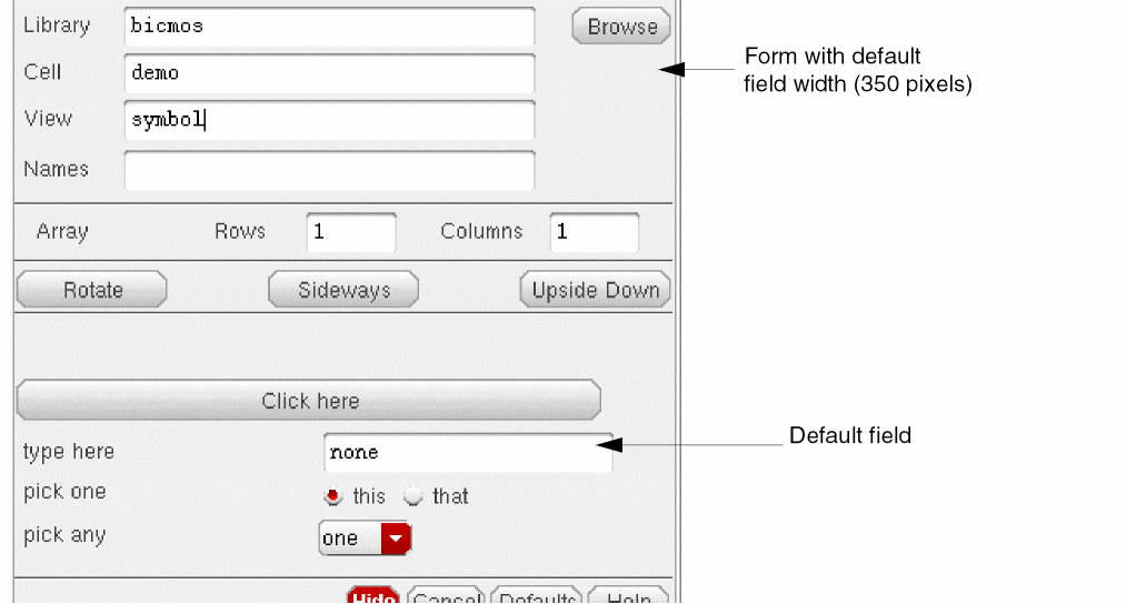You can adjust the width of a field with the Field width parameter in the Other Settings tab on the Edit CDF form. This parameter adjusts the width of string input fields only. (You adjust the width of a button field with the Button field width parameter in the Other Settings tab on the Edit CDF form.) The following examples show string input fields on two Add Instance forms. The following form shows the field at the default width of 350 pixels.