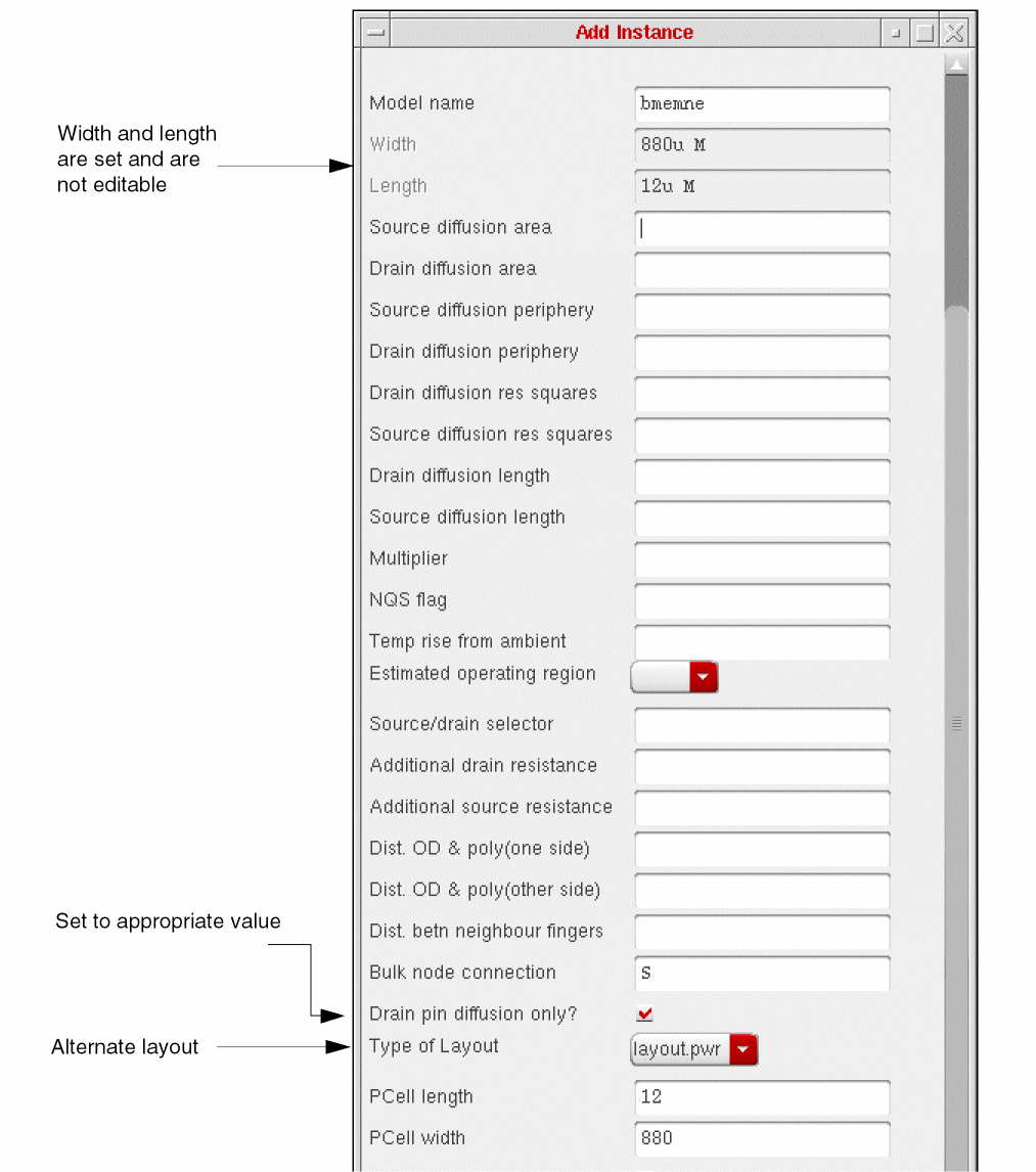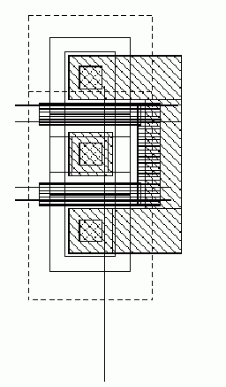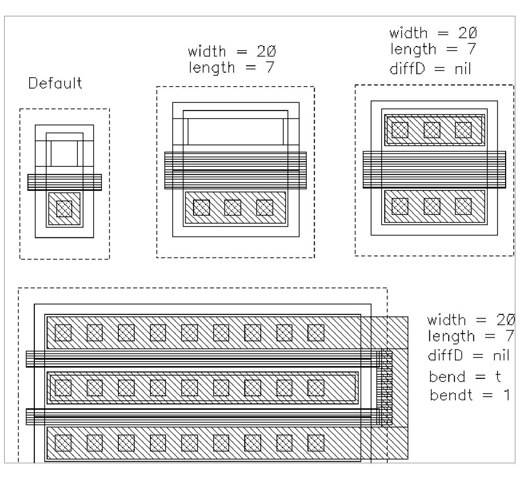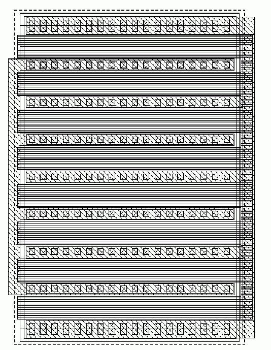 In addition, you need the fixed layout for the power applications. This might be stored under view layout.pwr, have a gate width of 880 micrometers and length of 12 micrometers, and look like this: