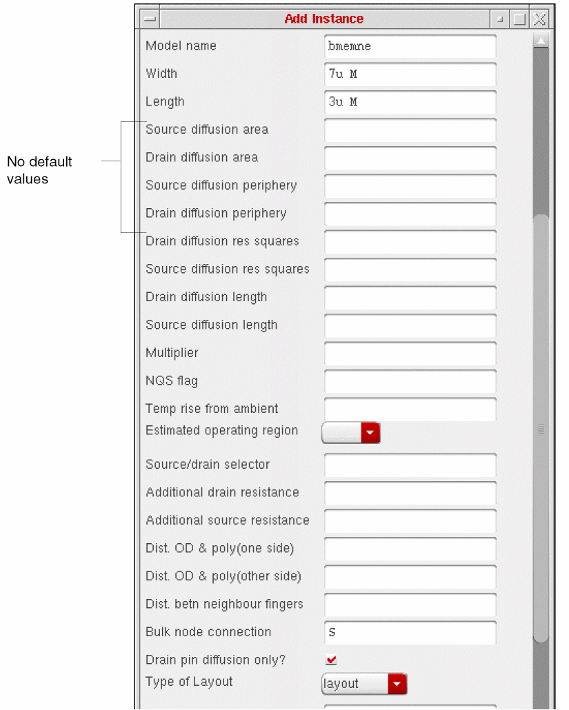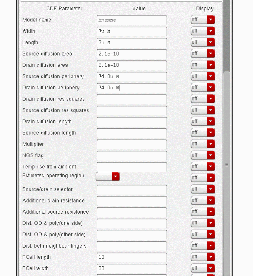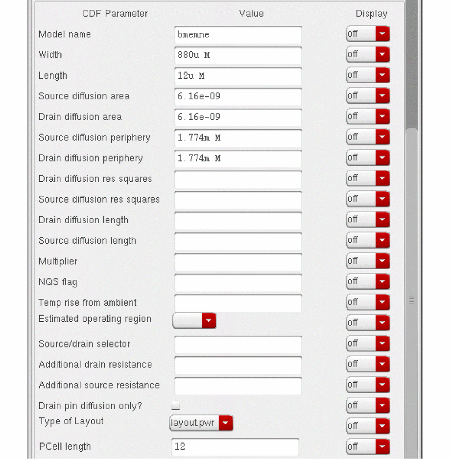 As you place instances of the NFET, you never change the value for the bulk node connection. Therefore, you might use the Edit CDF form to move that parameter down in the list of parameters until it is below other parameters that you do change.