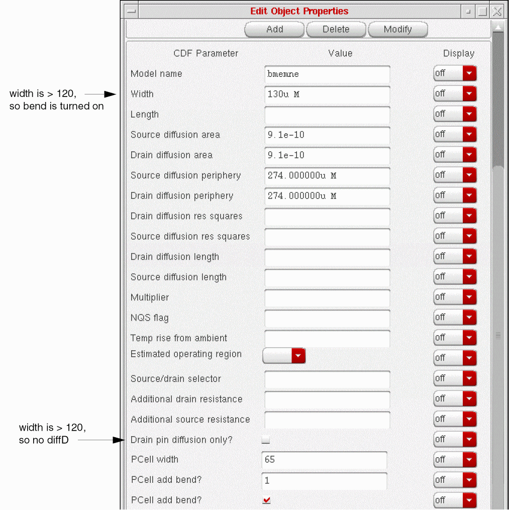 At this point you still cannot see if the Pcell parameters are being set properly. - Use the Edit – Properties – Object command on a few examples to verify the operation of the Pcell parameters in the CDF description.
