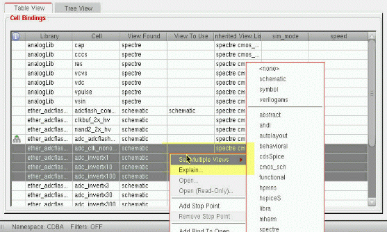 You can select multiple items in the Cell Bindings table, and apply specific operations to all of them, such as setting a binding, applying property values, setting a view list, setting stop points, and so on, using the context-sensitive menu.