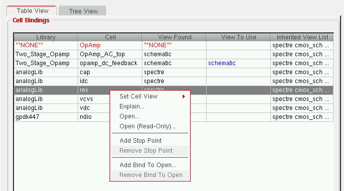 Right-clicking over the contents of the Cell Bindings table displays a context menu that contains options specific for use with the cell bindings listed.