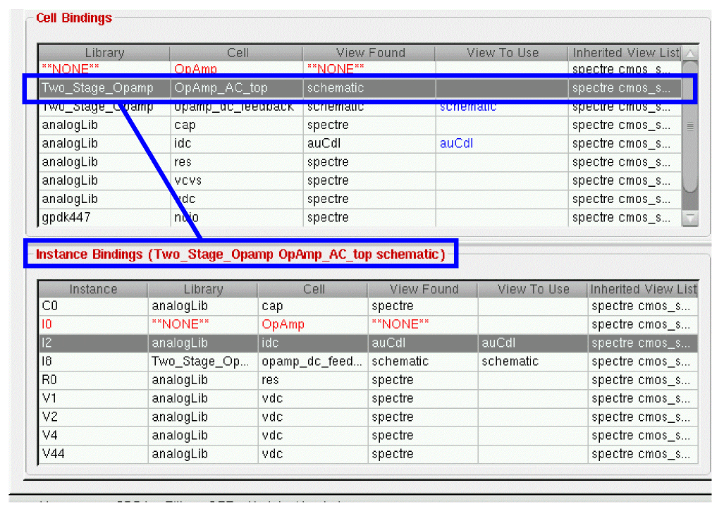 To display the Instance Bindings table, ensure that View – Instance Table has been selected, and that you also have an appropriate Lib/Cell/View selected in the Cell Bindings table.
