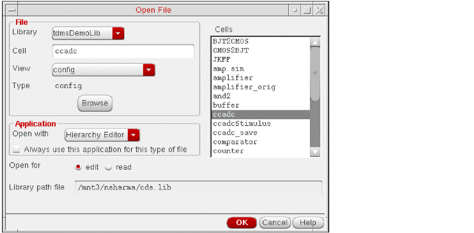 - In the File section of the form, select the library, cell, and view of the configuration that you want to open.
