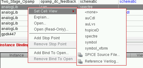 From the pop-up menu, select Set Cell View / Set Instance View / Set Occurrence View – SPICE Source File. For example:The Enter the SPICE/HSPICE source file Location form appears.
