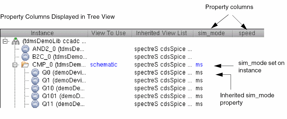 Property columns are displayed in both the table view and the tree view. Properties that are set directly on an object are displayed in blue (the default color for user-defined values); inherited properties are displayed in black.The View – Properties command is not available if the your_install_dir