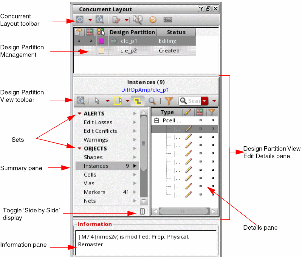 The Concurrent Layout assistant is a dockable assistant pane that provides various options that let you perform tasks related to concurrent layout editing. The assistant also displays alerts and other information about the design partition you are updating.