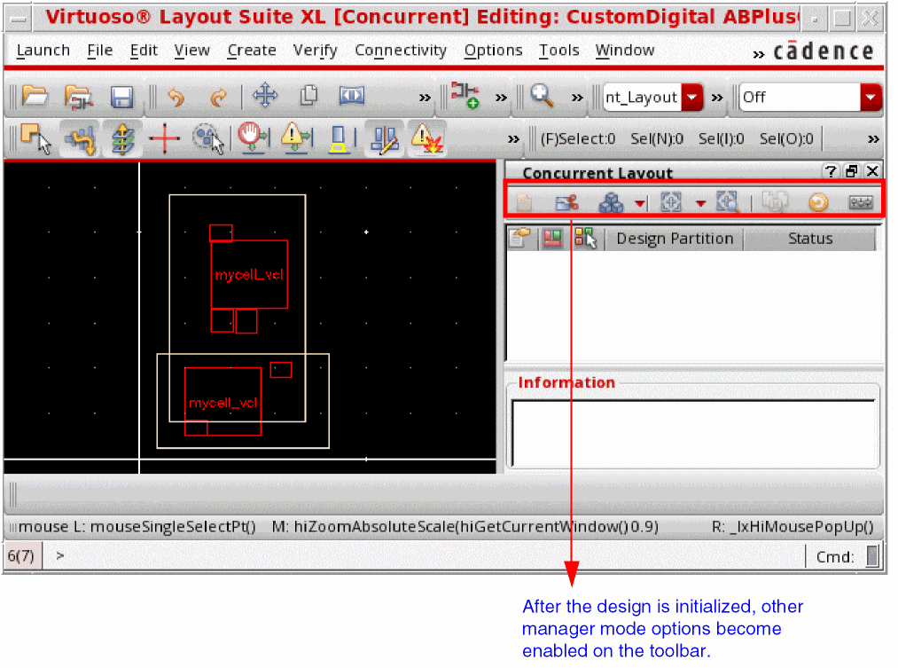 After you initialize the design, remaining buttons on the Concurrent Layout toolbar are enabled in manager mode.