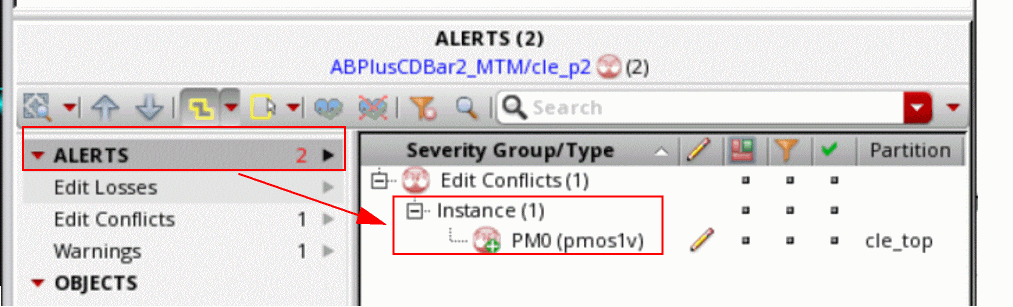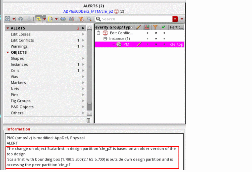 Consider an example where you move an instance PM0 in the design partition cle_p2 outside of the design partition area. This will introduce an outside area warning. Return to the top design and move the instance PM0 in the top design and save the top design. This will introduce an edit conflict against the design partition cle_p2. Now, when you edit in the design partition cle_p2, you will see two alerts, both associated with PM0, consolidated into one entry in the ALERTS section.