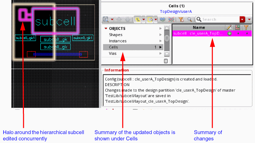 Changes made to the hierarchical design partition are saved in the hierarchical design partition view (child) pointed by a layout configuration. To verify incremental updates, you need to open or import a parent top-level design partition view with layout configuration. You can verify your updates, including all the changes in the child design partition view. These changes are applied to all occurrences of the subcell in the top-level design partition view.