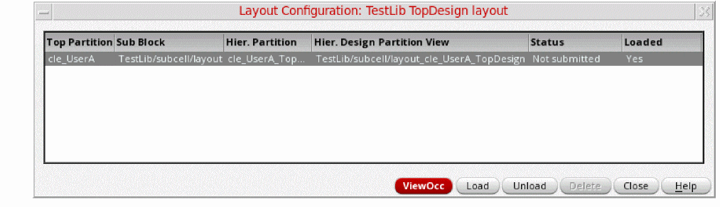 Yesin the Loaded column indicates that the incremental changes have been imported to the subcell. The manager can see layout configurations in all design partitions and load them as needed. Layout configurations are loaded automatically for the designer, which means the subcell design in memory will contain the incremental changes. However, if the designer opens the subcell cellview from the disk, the layout configuration is automatically unloaded and an Unloaded Configurations warning is displayed in the assistant. - Click the Load button after this subcell cellview is closed to refresh the selected layout configurations.