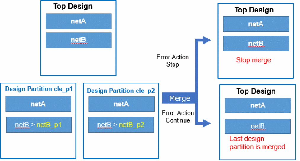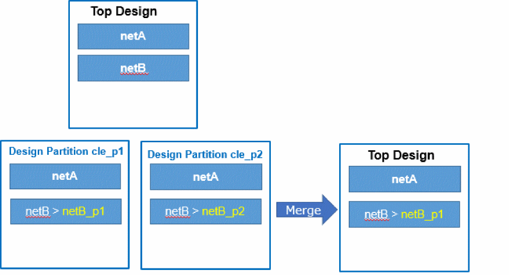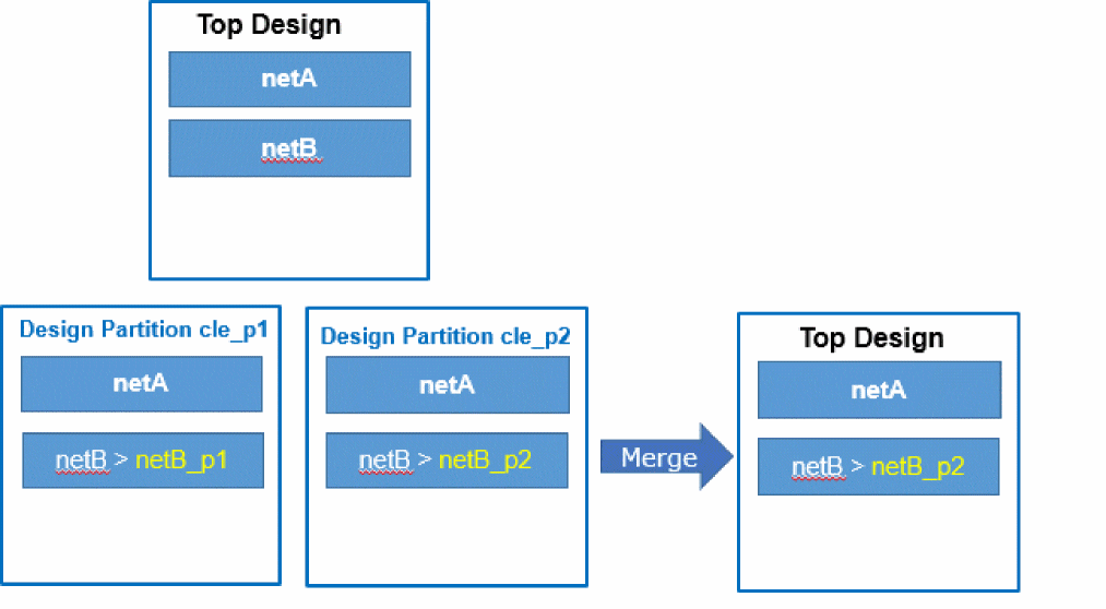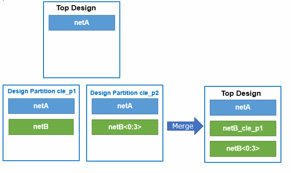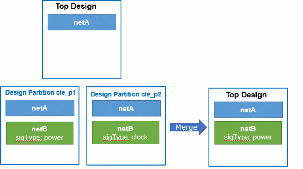 - Nets created in two design partitions (or in the top design) with the same user-specified name are automatically merged if their net types are same because this situation is not considered a conflict.