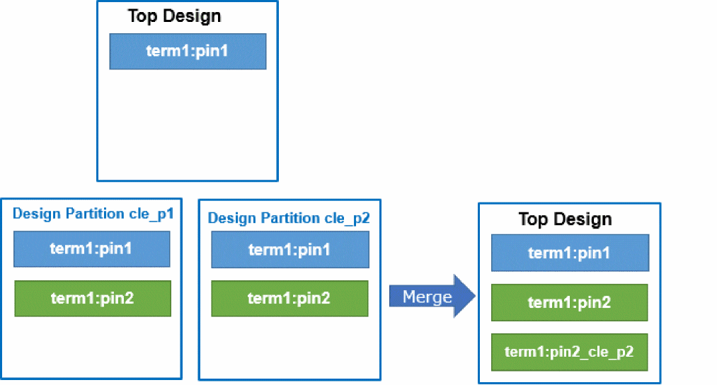 Pin and term name conflicts are treated like nets, except when they are created in two design partitions with the same user-specified name. The Rename option will rename the last and keep both (not automatically merged).