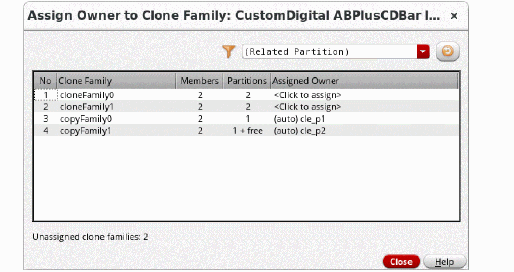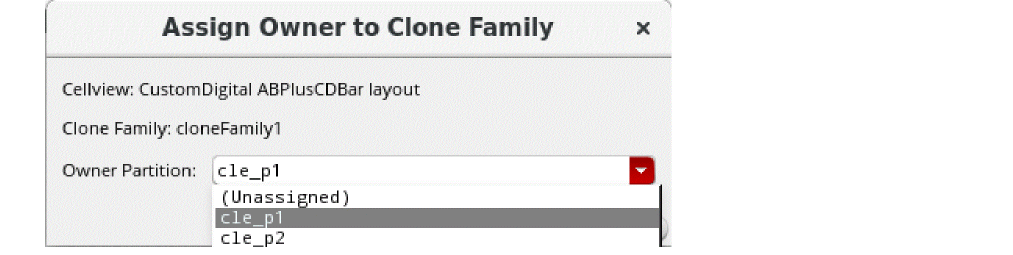 Select an unassigned clone family in this form, and then from the dialog box that displays, select the owner design partition from the Owner Partition dropdown list and click OK.