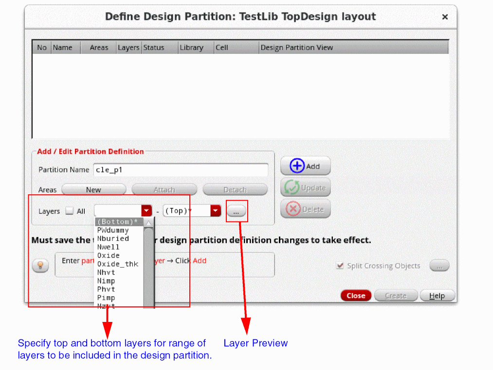 The Partition Layers form appears. Use this form to:- Preview the layers included in the design partition.