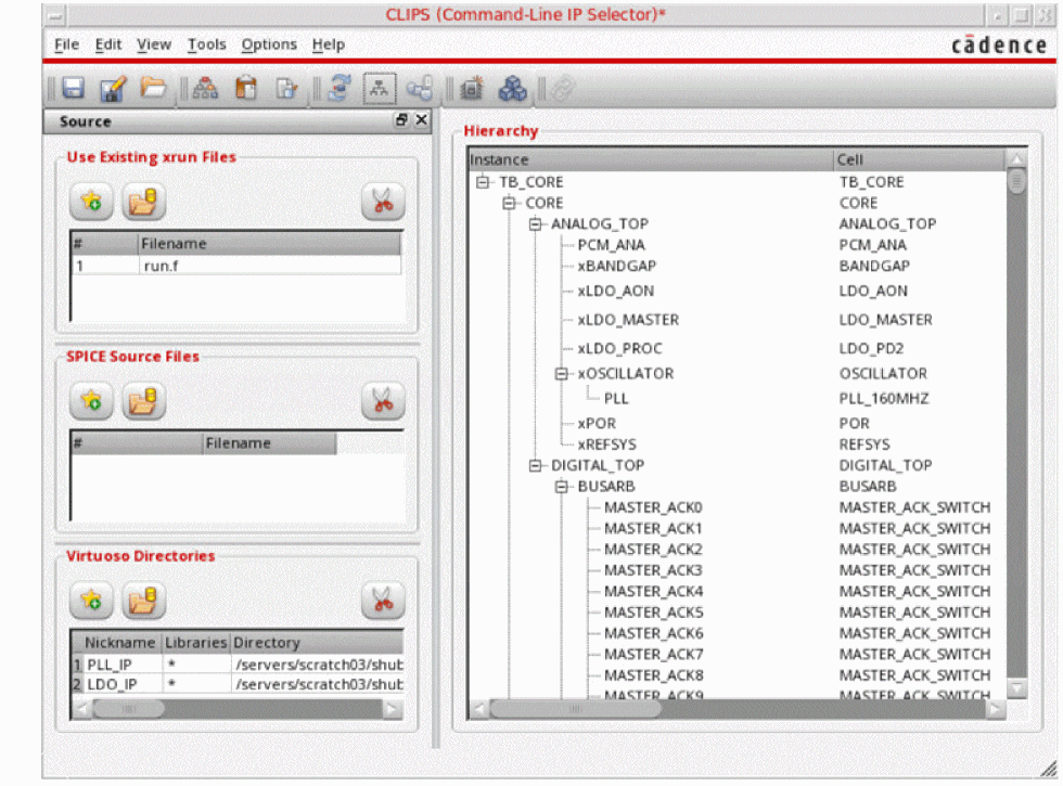clips -dirs ../PLL_IP -xrun xrunArgs -switch "inst=testbench.IP0.I11.I14 config=PLL_IP::amsPLL/dffnr_2x_hv/config ade=PLL_IP::amsPLL/pll_top/maestro:pll_top:1" -switch "inst=testbench.IP0.I11.I13 config=PLL_IP::amsPLL/nor2_2x_nv/config ade=PLL_IP::amsPLL/pll_top/ams_state" -batch