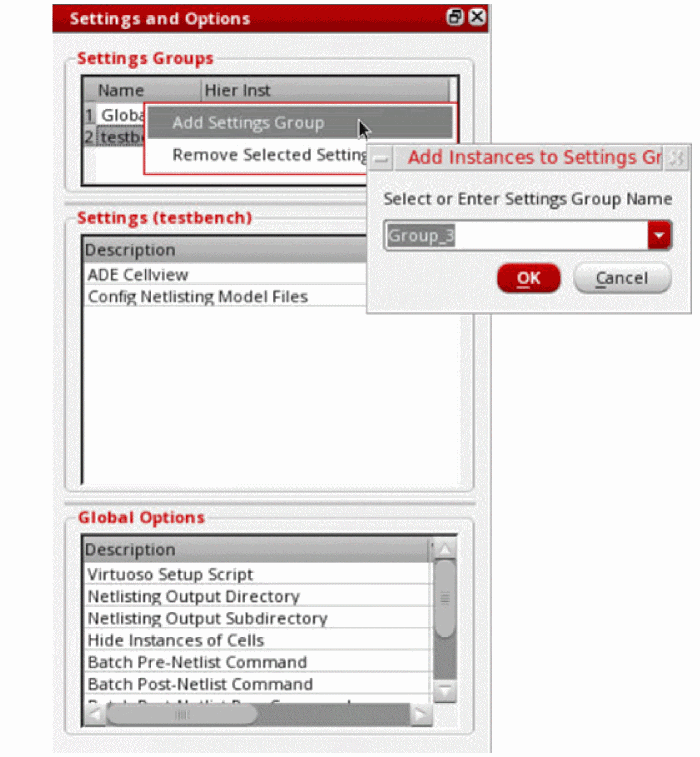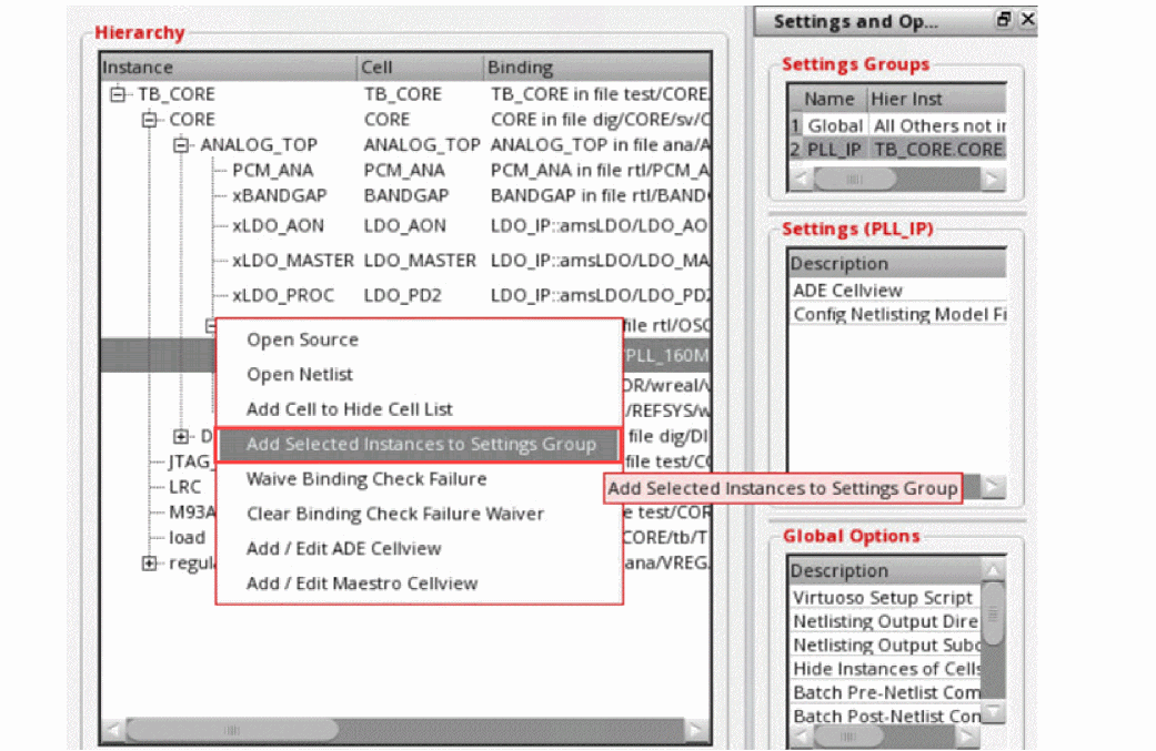 To add an instance to this group, right-click an instance in the Hierarchy sections of the CLIPS window and choose Add Selected Instances to the Settings Group.