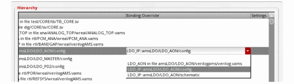 You can override a cellview binding to use a Virtuoso config or schematic view instead of a text cellview. The drop-down list in the Binding Override column shows the name of the corresponding library, cell, and config or schematic view.