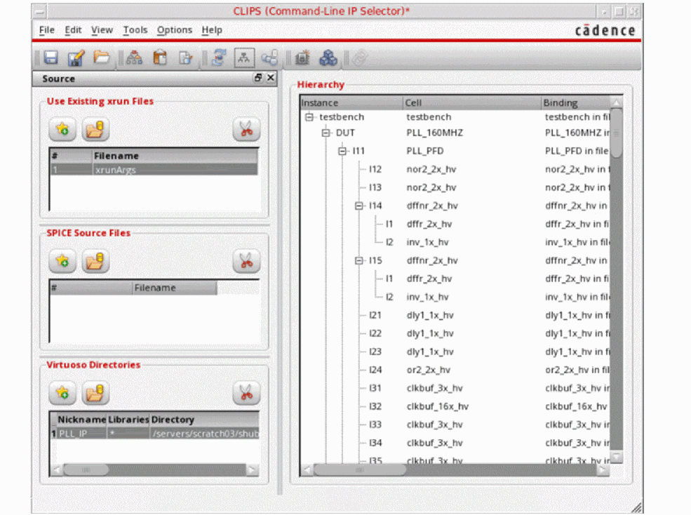 CLIPS searches the specified Virtuoso directories to look for the Virtuoso config files that can override the corresponding digital block in your design. By default, all the directories specified in the Virtuoso Directories section can be searched for config files. This is indicated by the * symbol shown in the Libraries column of this section. However, you can choose the libraries to be searched while finding the schematic or config files that can be overridden, that is, switchable IP configurations. Other Virtuoso directories are excluded from the search. This helps improve the searching and matching performance.