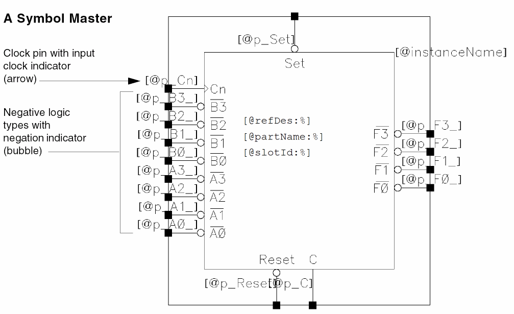defcell(t_cellName[t_pinType(t_pinName… ) ] [ defsymbol( [t_viewName] [ symbolProps(t_propName=g_propValue… [ defTermProp(t_defPinName t_propName=g_propValue) ] … [ defVisibleProp(t_propName=g_propValue[labelAttr] ] … ) ] [ symbolParam( [ wireSpacing =f_spacing ] [ wireLength =f_length ] [ vSideLength =f_vLength ] [ hSideLength =f_hLength ] [ pinConnector =t_connector] [ origin =t_origin] ) ] [ symbolLabels( defLabel( name(t_labelText)labelAttr… ) ] [ controlParam( [ queryMode =b_boolean] ) ] [ pinNumSpec( [t_pinName:x_pinNumber] … ) ] [ pinLocSpec( [ leftPins(t_leftPinName…) ] [ rightPins(t_rightPinName…) ] [ topPins(t_topPinName…) ] [ bottomPins(t_bottomPinName…) ] ) ] [ pinGraphicSpec( [t_pinName:t_pinGraph] … ) ] [ pinLogicSpec( [ positive(t_posPin… ) ] [ negative(t_negPin… ) ] ) ] [ clockPins(t_clockPin… ) ] ) ] )