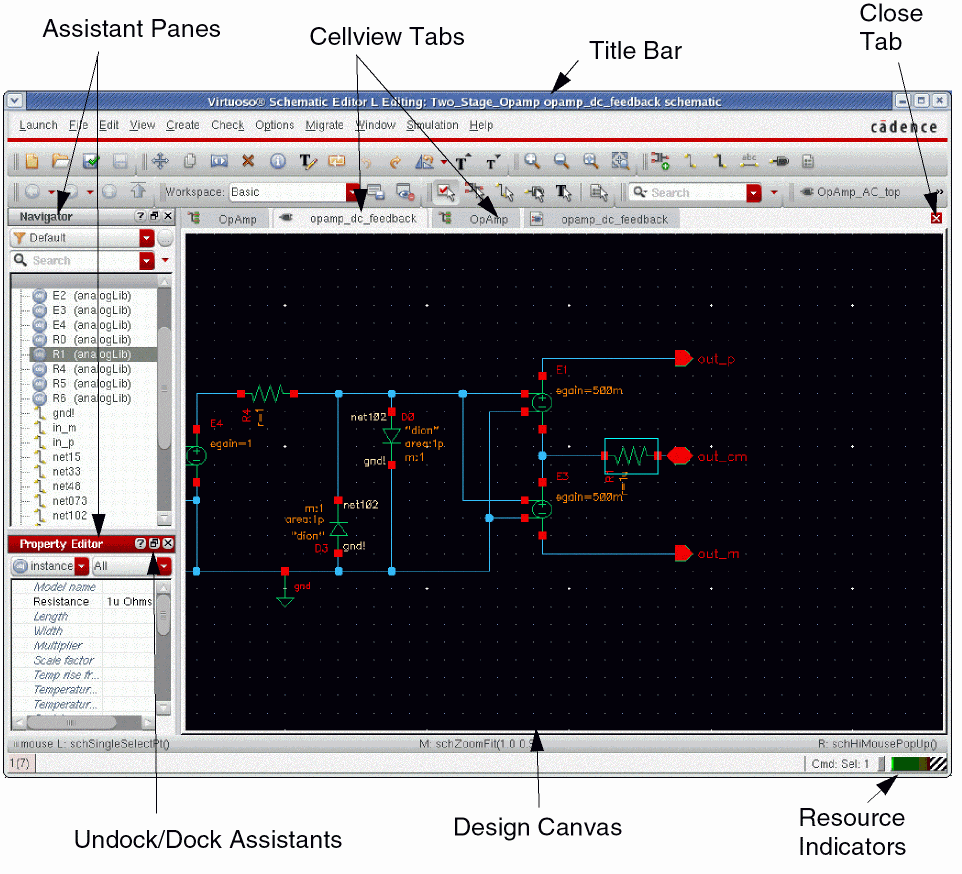 - For more information on window components, such as Workspaces and Toolbars, see the Virtuoso Design Environment User Guide. |