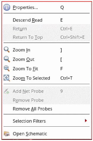 Options: Default Selection Filter / Instance Select Filter / Wire Select Filter / Pin Select Filter/ Text Select Filter / Open Selection Filter