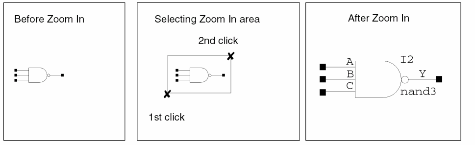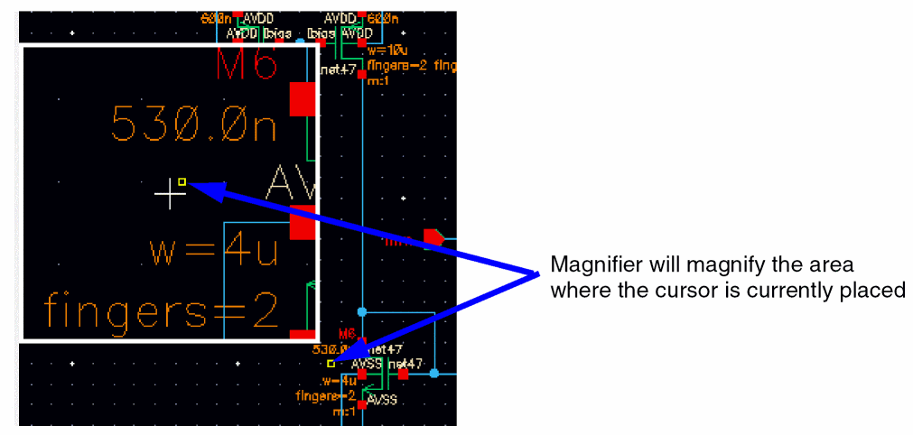 maskLayout”, schematicSymbol”, or “schematic” (as returned by deGetRootType). The magnifier.cdsenv setting values are also stored based on the root application type, therefore if a sub-application of, for example, schematic has its own .cdsenv variables, then it would still need to have them set at the root application level for them to take effect.To activate the magnifier on the design canvas: