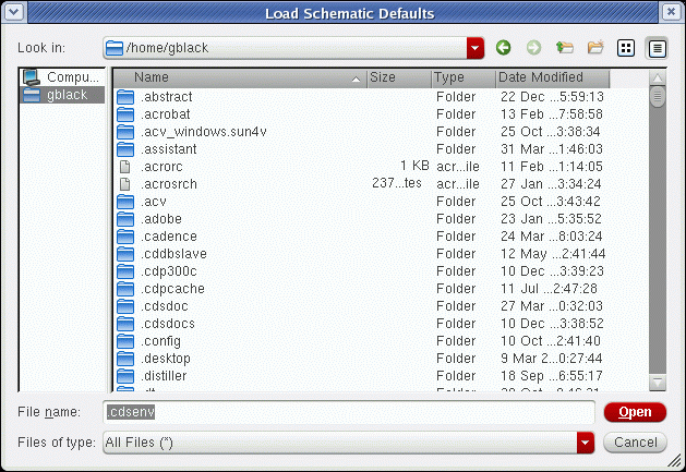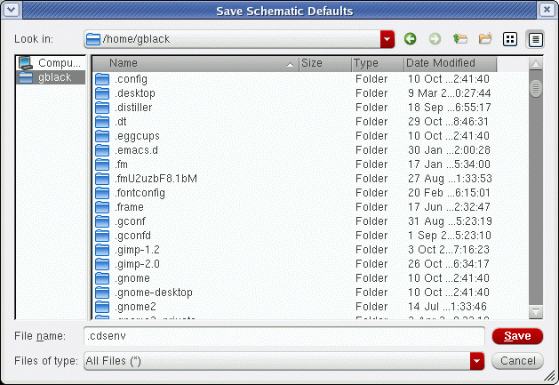 The filename specifies the name of the file where the variables and form defaults are saved. The default is a file named.cdsenvin your home directory. If you use this filename, the saved variables are automatically loaded the next time you start the editor.