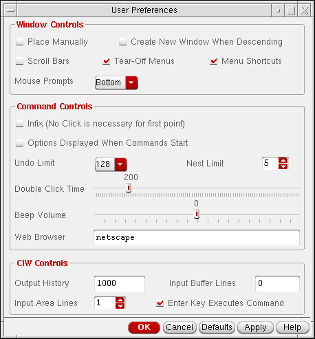 You can change window and command preferences from the CIW by using Options – User Preferences, described in Virtuoso Design Environment User Guide. To make changes permanent, from the CIW choose Options – Save Defaults or edit the .cdsinit file.