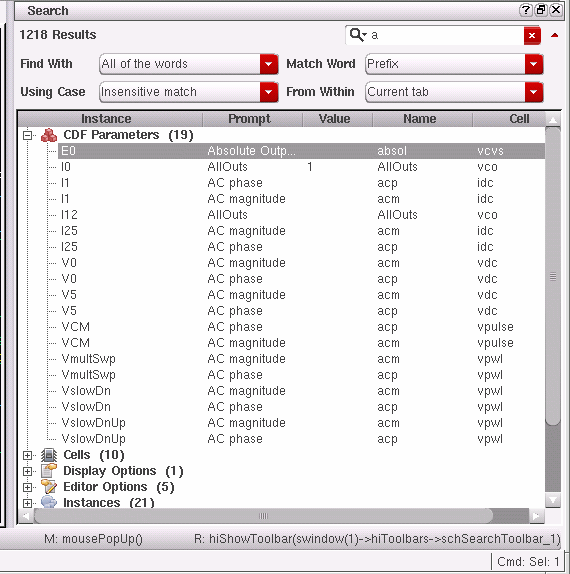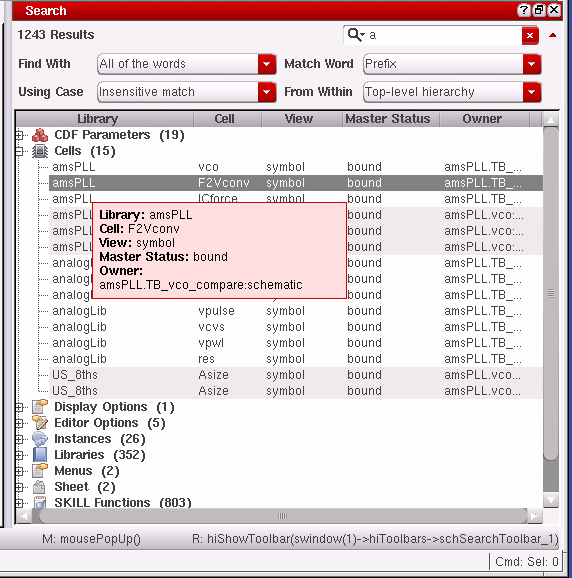 Search uses Virtuoso platform data structures and commands, and presents them through an interactive UI allowing you to refine queries based on the results fed back. Precise searches within searches are then possible as design data is structured and contains unique identifiers for netlisting and backannotation purposes.