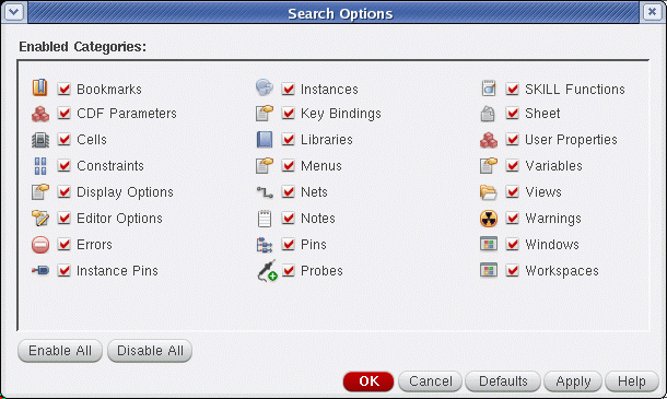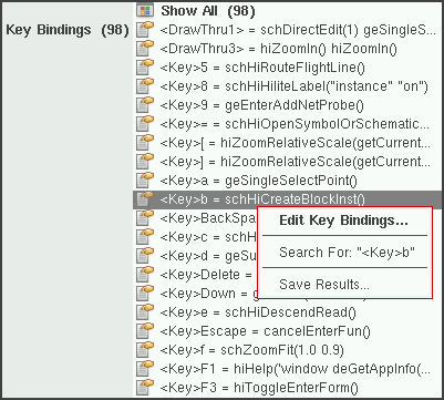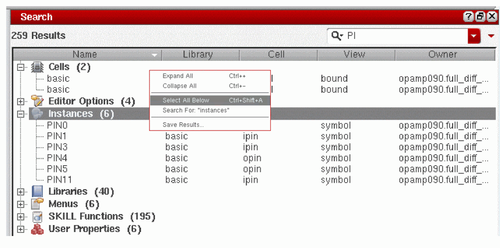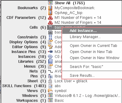 A right-click over a particular category result may also provide context-menu options related to that object selection. For example, a right-click over a Libraries or Cells category result will provide options to Add Instance or invoke the Library Manager, and a right-click over a Note category result will provide an Edit Note option.Other examples would be right-clicking over a SKILL function result and accessing the SKILL Finder Window, or right-clicking over a key binding and accessing the Bindkey Editor by selecting the Edit Key Bindings option.