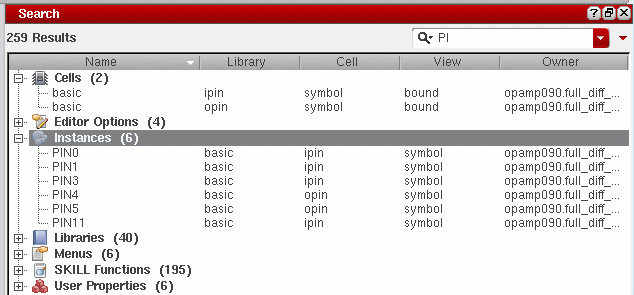For any given search result, the owner is usually a cellview in the form lib:cell:view. As this information can be expansive it is detailed in a separate Owner column, displaying those results found in the current window with a white background and those found out-of-context in a gray background. The Owner column can then be sorted to group results by their source cellview rather than by (the default) object name.