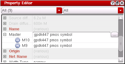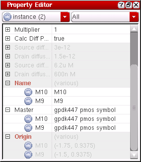 The Property Editor displays information for the currently selected set of objects. As you select or deselect objects in the editor window the Property Editor display is automatically updated. If no objects are selected in the design canvas, the Property Editor displays the properties of the current cellview.