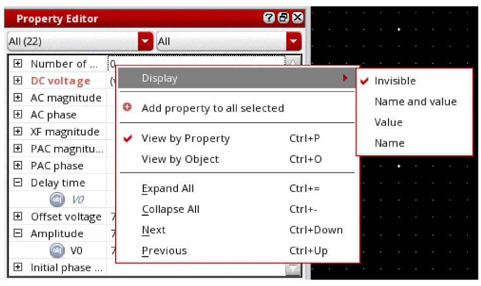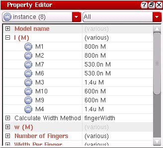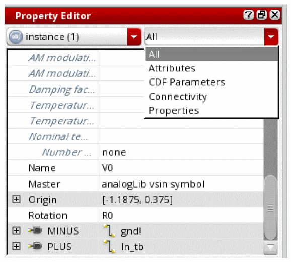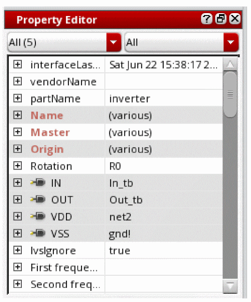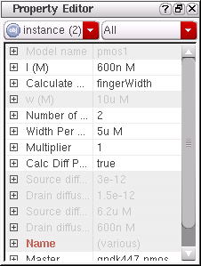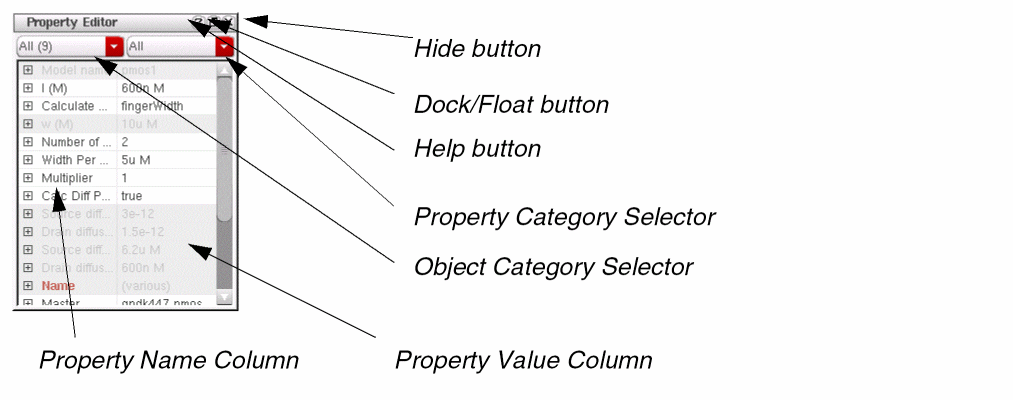The Property Editor is a dockable assistant pane that provides a flexible framework for defining a collection of objects and their associated properties. An object represents a component of interest in an application, for example a wire segment in a schematic, a constraint, or an analysis to be passed to a simulator. Properties are the characteristics of these objects and can be viewed and edited as required.