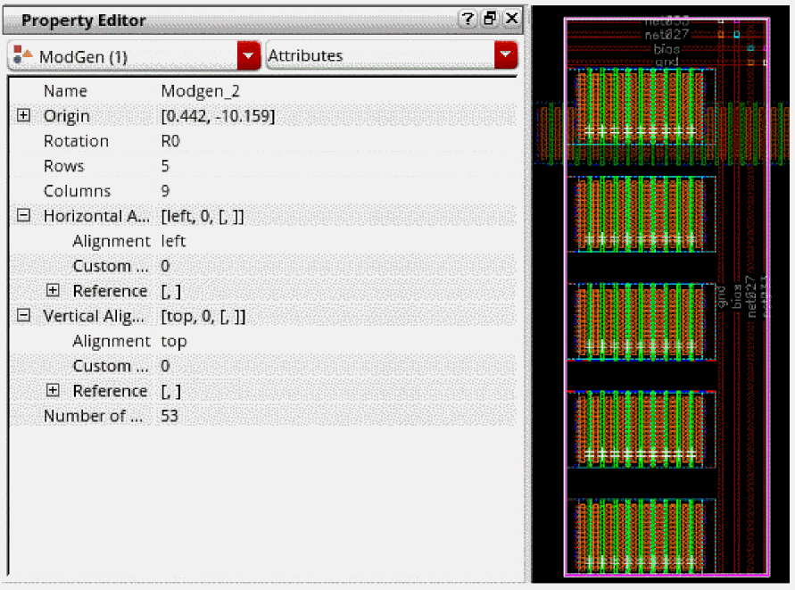 You can use the Property Editor assistant to interactively update the properties of individual Modgen instances and Modgen arrays containing stack-type members. Any changes you make to the instance properties are immediately applied to the Modgen in the layout canvas, as displayed in the figure below.