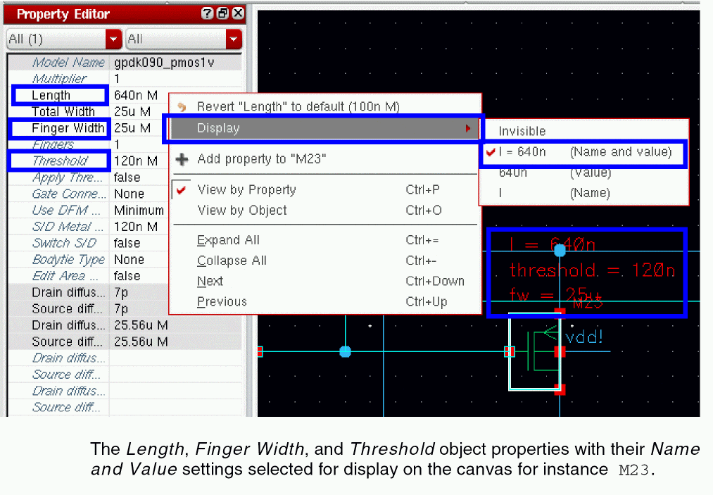 For more information on basic, system and user-defined properties, see the Edit Object Properties form in the Virtuoso Schematic Editor L User Guide. -