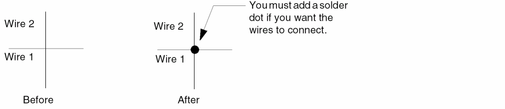 If you draw two wires that cross, you must explicitly add a solder dot to make the connection at the crossover.