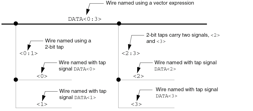 You can connect single-bit wires in your design using any one of the following conventions: