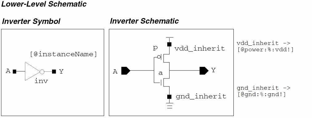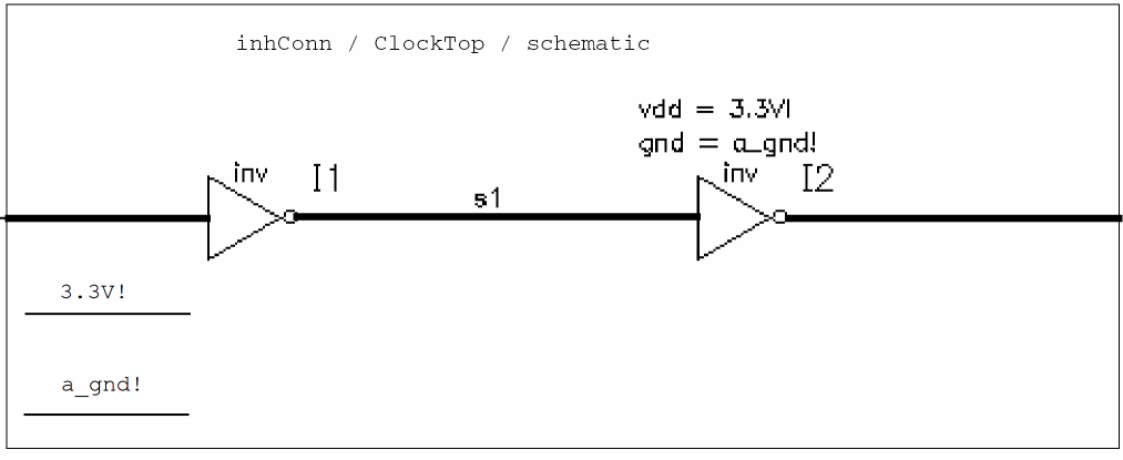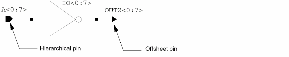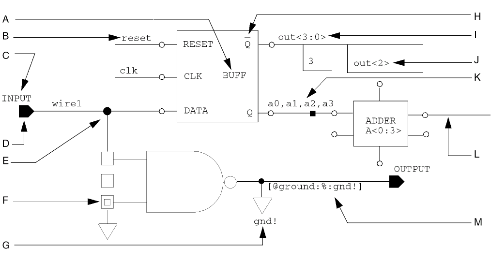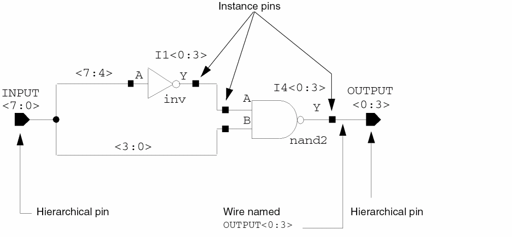 A complete schematic design provides input data for a variety of design tools, such as simulation and layout. It is essential, therefore, that you establish connectivity in your schematic designs. The following diagram shows connectivity and naming conventions.
