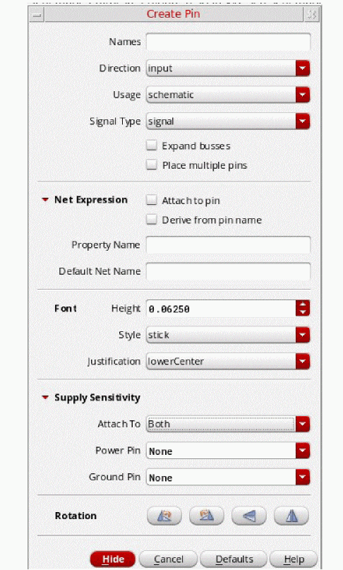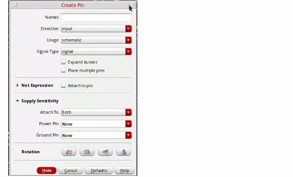 The behavior of the Create Pin form in the symbol window is as described for the schematic window (see Setting Supply and Ground Sensitivity (Schematic Window), in that you would also expand Supply Sensitivity to expand the Create Pin form.
