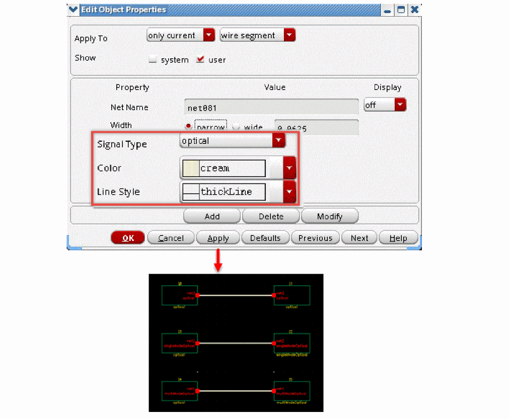 Use the Edit Object Properties – Pin form to view or edit optical signal types optical, singleModeOptical, and multiModeOptical on pins and wires. You can set a distinctive color and line style to identify the optical wires.