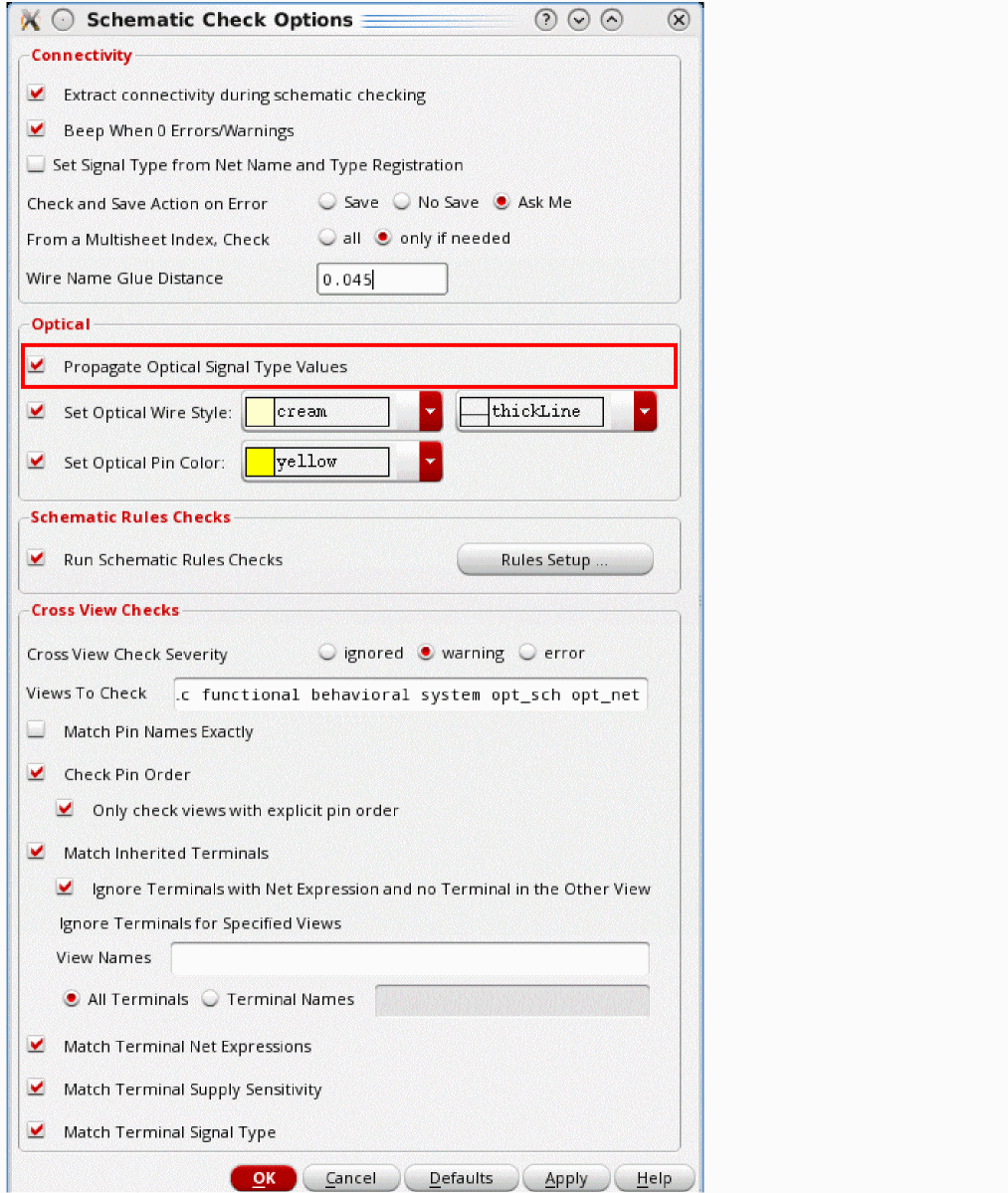 You can disable the optical signal type propagation by clearing the Propagate Optical Signal Type Values check box. For more information about the other options on the Schematic Check Options form, see Schematic Check Options.