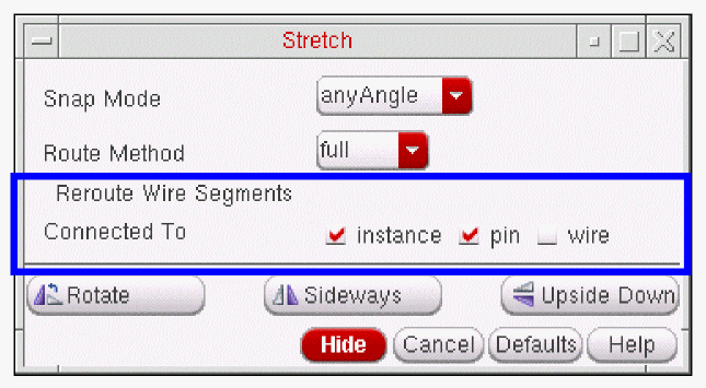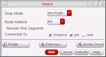The Reroute Wire Segments Connected To option, in the Stretch form, can be used with instances, pins, and/or wires.