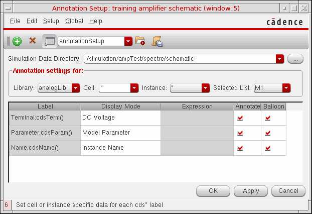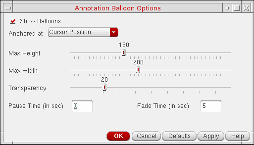 ./.cadencedirectory when you exit the Annotation Balloon Options form, or click the OK or Apply button. These settings are loaded when you open a new Virtuoso session.
