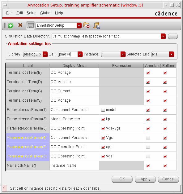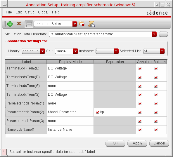 When you use wildcards in the Cell drop-down list box, the Display Mode and Expression for only the common Labels are displayed in the Annotation Setup form. The labels that are not common are set tonone. As shown in the above image, when you specify*mos4in the Cell drop-down list box, the Display Mode and Expression columns display information related to all common labels fornmos4,pmos4,cmos4, andtmos4. The labels that are not common are set tonone. - Select the check box for each label for which you want to display the annotation data on the schematic canvas or on the annotation balloon. By default, all the annotations are displayed on the schematic as well as on the annotation balloons.