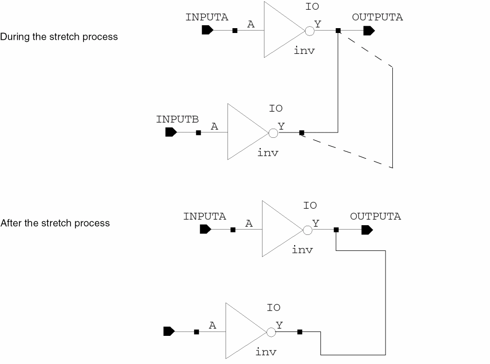 - The Stretch command does not stretch objects from one cellview to another.