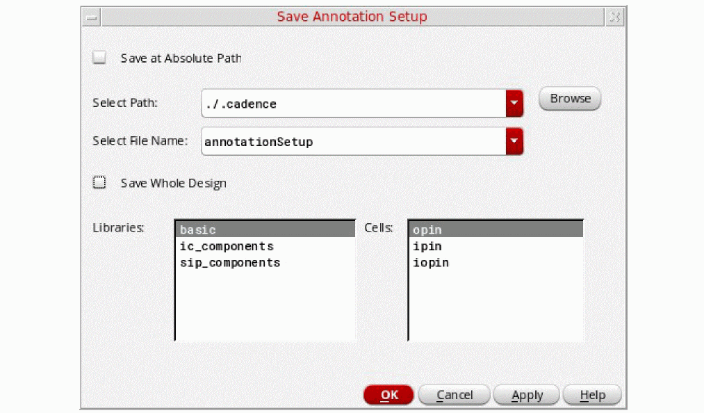 - Select the Save Whole Design check box if you want to save the complete design. To save the annotation settings to a specific library or cell, make the required selections from the Libraries and Cells list boxes. To select multiple libraries or cells, keep the SHIFT or CTRL key pressed while making the required selections.