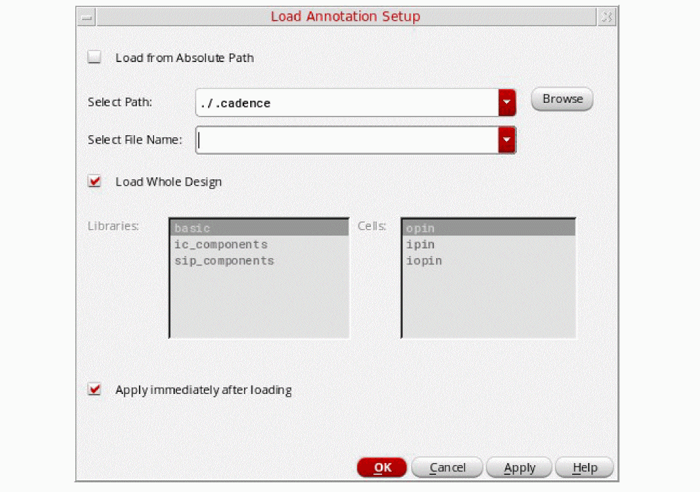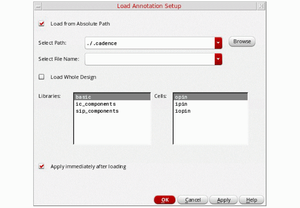 .cadencedirectory. Deselect the check box to load the annotation files from the.cadence/dfII/annotationSetups/<Lib>/<Cell>/<View>directory. For additonal details, refer to Loading the Shared Annotation Settings Manually. -