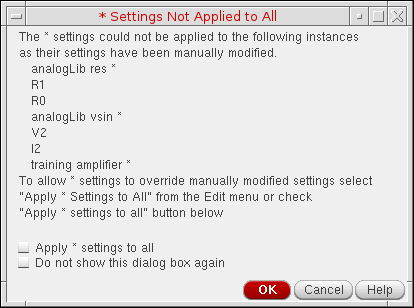 On the displayed dialog box, you can select the Apply * settings to all check box to apply the * level annotation settings to all the instances of the selected library or cell.